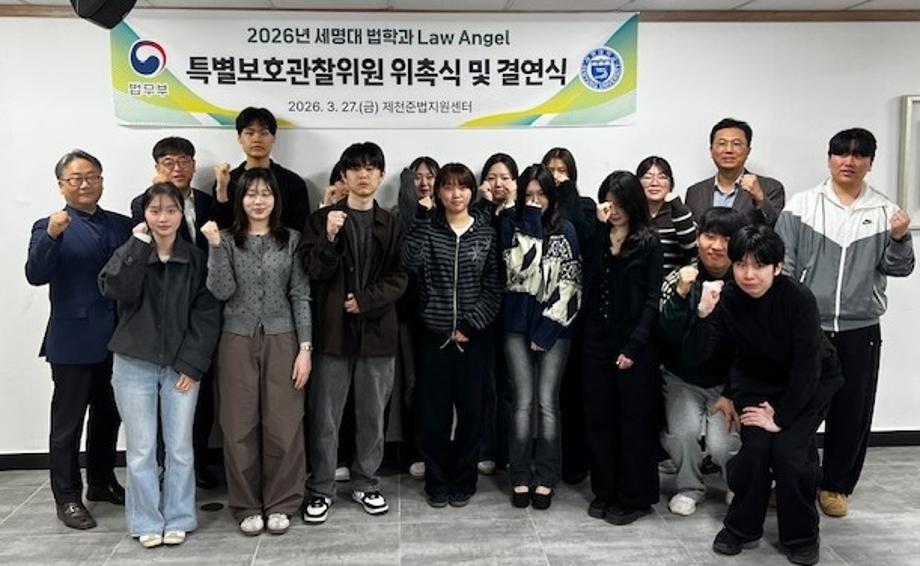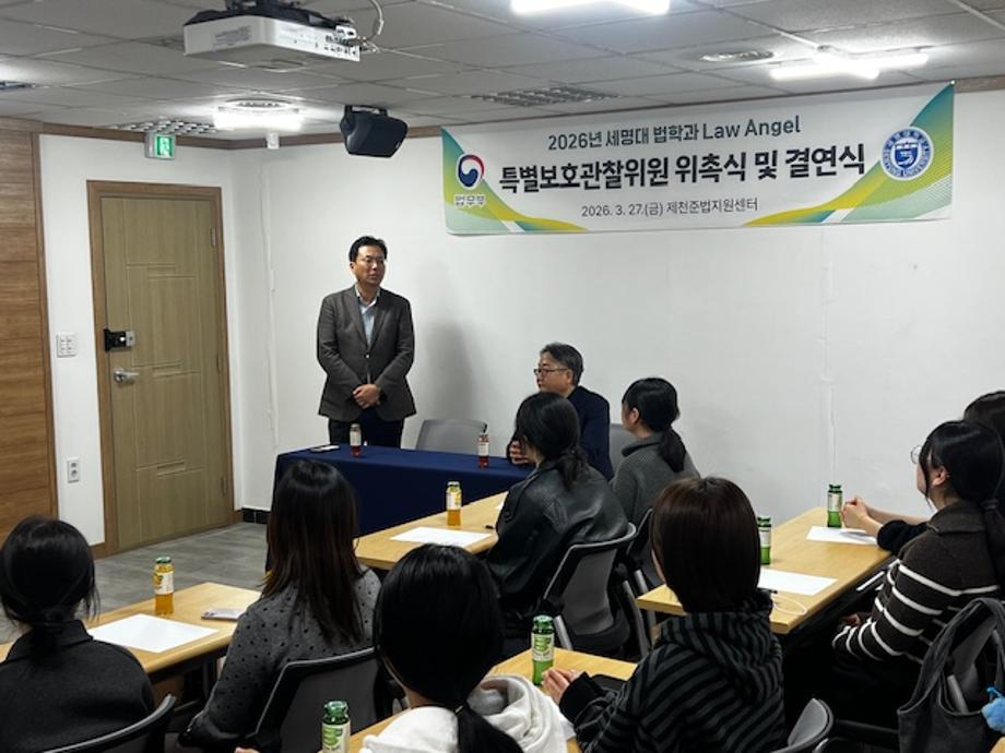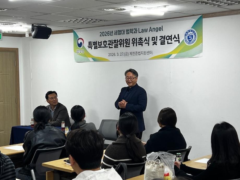 본문 시작 홈으로 커뮤니티 학과안내 교수소개 학과과정 커뮤니티 홈페이지가이드 학과사진첩 공지사항 취업정보 학과사진첩 학과행사 동아리 학생회 교우소식 학과사진첩 페이스북 트위터 프린트 2026. 03. 27. Law Angel 위촉식 법학과 113 2026-04-01 지난 3월 27(금) 15:30에 제천보호관찰소에서 로엔젤 학생들이 특별보호관찰위원 위촉식을 진행하였습니다. 목록 이전겨울방학 해외 배낭여행-푸꾸옥 담당부서 : 법학과 담당자 : - 연락처 : 043-649-1764 최종수정일 : 2024-10-26 만족도조사 만족도 조사 이 페이지에서 제공하는 정보에 대하여 만족하시나요? 매우만족 만족 보통 불만족 매우불만족