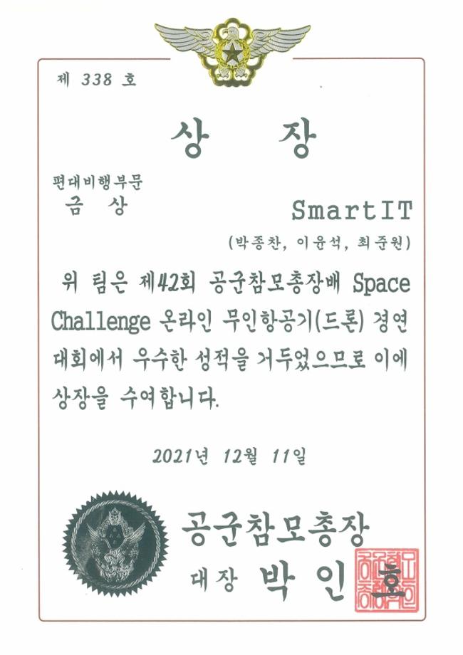 제42회 공군참모총장배 Space Challenge 대회는 코로나19로 인한 사회적 거리두기 차원에서 온라인 무인항공기(드론) 경연대회로 개최되었으며, 10월 11일 참가 접수를 시작으로, 온라인 예선, 결선, 그리고 12월 11일 시범경기 및 시상식으로 약 2달간 여정의 막을 내렸습니다. 대회는 단독비행, 정밀폭격, 편대비행 총 3개 종목으로 구성되었으며, SmartIT 팀이 참가한 편대비행 종목은 프로그래밍을 통해 3기 이상의 드론을 음악에 맞춰 동시에 비행하는 방식으로 진행되었고, SmartIT 팀은 5기의 드론을 프로그래밍으로 비행하였으며, 총 26개 참여팀 중 1등 금상의 영예를 안게 되었습니다.