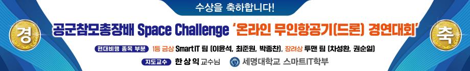 세명대학교 스마트IT학부 재학생 17학번 이윤석, 최준원, 16학번 박종찬은 SmartIT 팀으로 대한민국공군에서 개최한 제42회 공군참모총장배 Space Challenge 온라인 무인항공기(드론) 경연대회 편대비행 종목에 참가하여 1등 금상을 수상하였습니다. SmartIT 팀은 넥플릭스 드라마 ‘오징어게임’의 주제곡을 배경으로 다섯 기의 드론을 음악과 조화를 이뤄 구동시켰으며 독창적인 퍼포먼스로 찬사를 받았습니다. 스마트IT학부 재학생 17학번 차성환, 권순일도 투맨 팀으로 대회에 참가하여 장려상을 수상하였습니다.