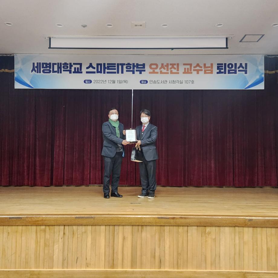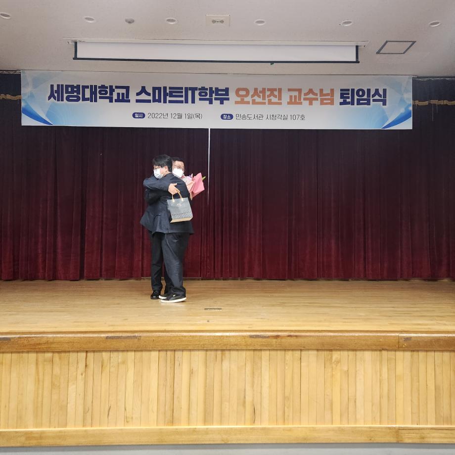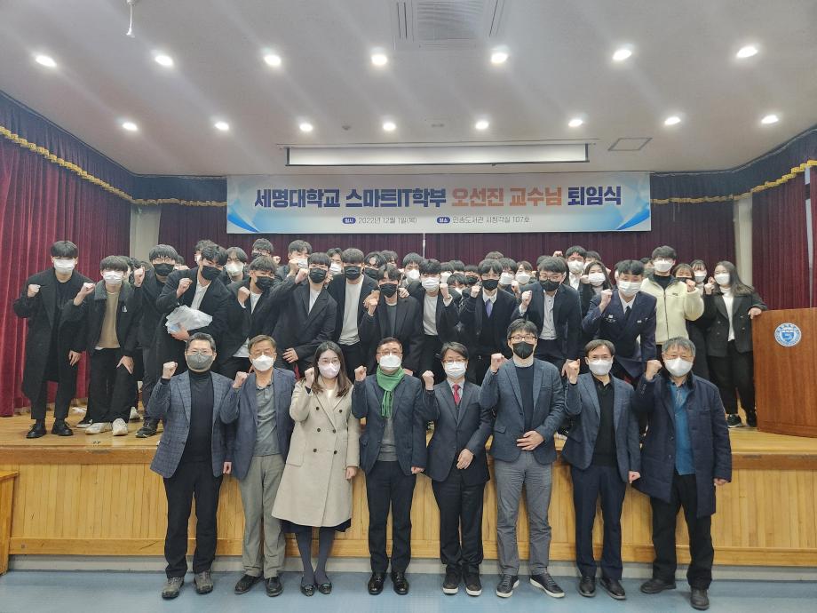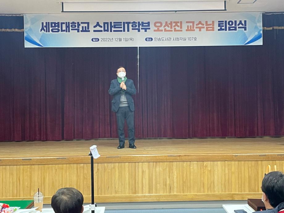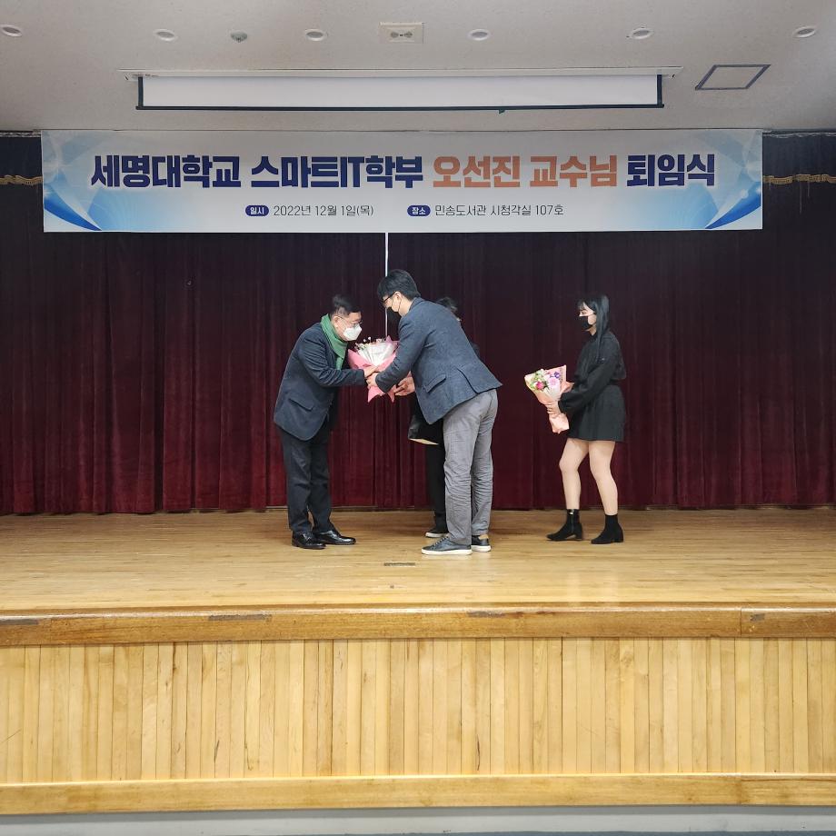 본문 시작 홈으로 SMIT 소식 SMIT 소개 SMIT 교육 SMIT 취업 SMIT 소식 SMIT 입학 홈페이지가이드 갤러리 공지사항 갤러리 경진대회 동아리 갤러리 페이스북 트위터 프린트 오선진 교수님 퇴임식 스마트IT학부 4722 2022-12-06 2022.12.01(목)에 스마트IT학부 오선진 교수님의 명예로운 퇴임식이 시행 되었다. 본 행사는 <캡스톤 디자인 중간 발표회> 행사가 끝난 후 진행 되었다. 학생들의 영상편지와 재직 기념패 증정 및 꽃다발 증정으로 이루어졌다. 오선진 교수님의 퇴임사와 김지홍 교수님의 축하 인사말이 있었다. 스마트IT학부 재학생들과 교수님들은 진심으로 오선진 교수님의 명예로운 퇴임을 축하 하였다. 목록 이전스마트IT학부 2022학년도 캡스톤중간발표회 시행 다음 스마트IT학부 원주 대성고등학교 특강시행 담당부서 : 스마트IT학부 담당자 : - 연락처 : 043-649-1275 최종수정일 : 2024-10-26 만족도조사 만족도 조사 이 페이지에서 제공하는 정보에 대하여 만족하시나요? 매우만족 만족 보통 불만족 매우불만족