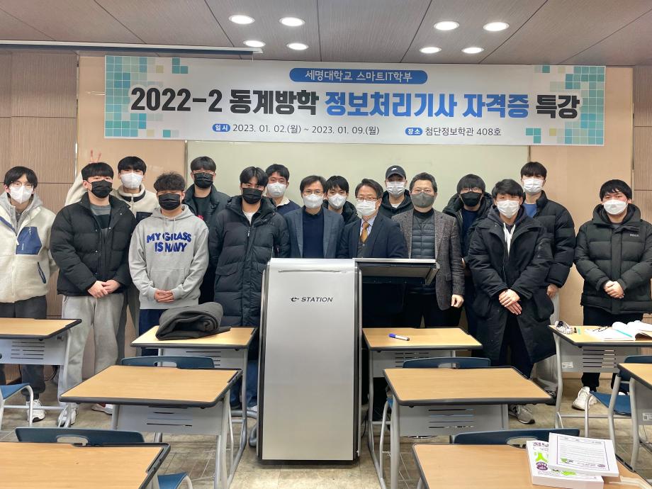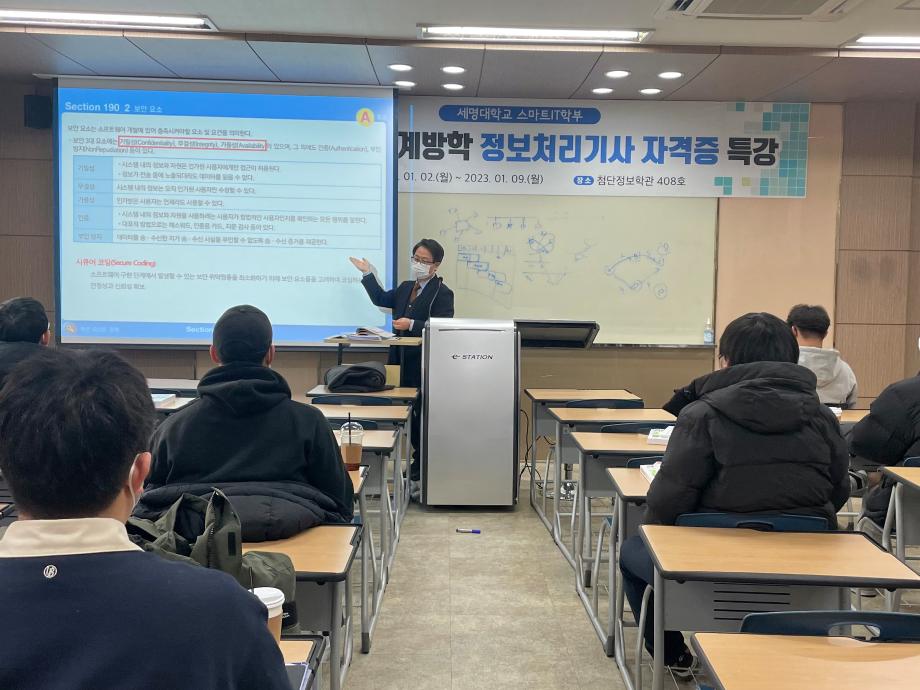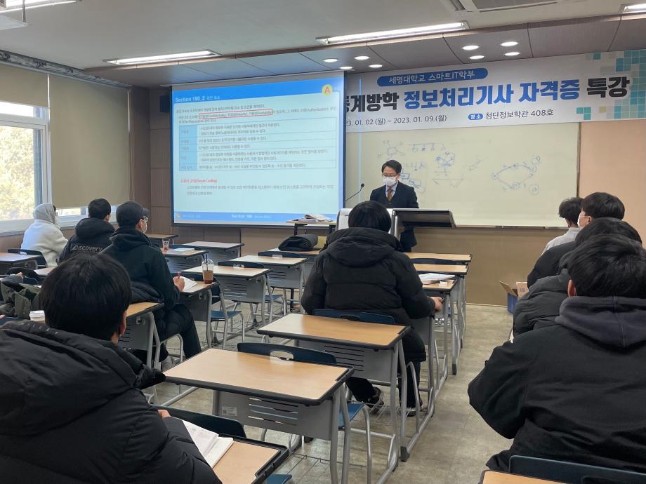 스마트IT학부는 2023.01.02~01.09 총 6일동안 3학년 학생들을 대상으로 정보처리기사 자격증 특강을 시행한다.