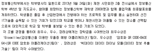 본문 시작 홈으로 SMIT 소식 SMIT 소개 SMIT 교육 SMIT 취업 SMIT 소식 SMIT 입학 홈페이지가이드 갤러리 공지사항 갤러리 경진대회 동아리 갤러리 페이스북 트위터 프린트 정보통신학부 연합 MT 개최 오선진 6954 2013-10-11 단양 대명 리조트 목록 이전2013학년도 졸업작품전 개최 다음 2013-2학기 졸업생 초청 학술특강 개최 담당부서 : 스마트IT학부 담당자 : - 연락처 : 043-649-1275 최종수정일 : 2024-10-26 만족도조사 만족도 조사 이 페이지에서 제공하는 정보에 대하여 만족하시나요? 매우만족 만족 보통 불만족 매우불만족