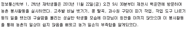 본문 시작 홈으로 SMIT 소식 SMIT 소개 SMIT 교육 SMIT 취업 SMIT 소식 SMIT 입학 홈페이지가이드 갤러리 공지사항 갤러리 경진대회 동아리 갤러리 페이스북 트위터 프린트 정보통신학부 봉사활동 정보통신학부 7075 2013-12-03 정보통신학부, ETRI&KISTI 견학 목록 이전정보통신학부, 농촌 봉사활동 실시 다음 정보통신학부, 취업박람회 견학 담당부서 : 스마트IT학부 담당자 : - 연락처 : 043-649-1275 최종수정일 : 2024-10-26 만족도조사 만족도 조사 이 페이지에서 제공하는 정보에 대하여 만족하시나요? 매우만족 만족 보통 불만족 매우불만족