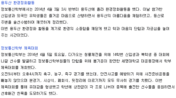 본문 시작 홈으로 SMIT 소식 SMIT 소개 SMIT 교육 SMIT 취업 SMIT 소식 SMIT 입학 홈페이지가이드 갤러리 공지사항 갤러리 경진대회 동아리 갤러리 페이스북 트위터 프린트 정보통신학부, 2014학년도 졸업작품중간발표회 개최 오선진 6762 2014-06-20 정보통신학부, 2014학년도 졸업작품중간발표회 개최 목록 이전정보통신학부, 용두산정화활동 및 체육대회실시 다음 정보통신학부, 글로벌 MT 개최 담당부서 : 스마트IT학부 담당자 : - 연락처 : 043-649-1275 최종수정일 : 2024-10-26 만족도조사 만족도 조사 이 페이지에서 제공하는 정보에 대하여 만족하시나요? 매우만족 만족 보통 불만족 매우불만족