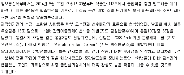 본문 시작 홈으로 SMIT 소식 SMIT 소개 SMIT 교육 SMIT 취업 SMIT 소식 SMIT 입학 홈페이지가이드 갤러리 공지사항 갤러리 경진대회 동아리 갤러리 페이스북 트위터 프린트 정보통신학부, 글로벌 MT 개최 오선진 6657 2014-10-02 2014년 9월 19일 - 20일춪주 켄싱톤 리조트 목록 이전정보통신학부, 2014학년도 졸업작품중간발표회 개최 다음 정보통신학부 졸업작품 전시회 및 학부 특성화 사업 설명회 개최 담당부서 : 스마트IT학부 담당자 : - 연락처 : 043-649-1275 최종수정일 : 2024-10-26 만족도조사 만족도 조사 이 페이지에서 제공하는 정보에 대하여 만족하시나요? 매우만족 만족 보통 불만족 매우불만족