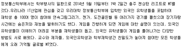 본문 시작 홈으로 SMIT 소식 SMIT 소개 SMIT 교육 SMIT 취업 SMIT 소식 SMIT 입학 홈페이지가이드 갤러리 공지사항 갤러리 경진대회 동아리 갤러리 페이스북 트위터 프린트 정보통신학부 졸업작품 전시회 및 학부 특성화 사업 설명회 개최 오선진 7250 2014-10-07 정보통신학부 졸업작품 전시회 및 학부 특성화 사업 설명회 개최 목록 이전정보통신학부, 글로벌 MT 개최 다음 한방·의료 ICT 융합 인재 양성 사업단, 오송 국제 바이오 엑스포 견학 담당부서 : 스마트IT학부 담당자 : - 연락처 : 043-649-1275 최종수정일 : 2024-10-26 만족도조사 만족도 조사 이 페이지에서 제공하는 정보에 대하여 만족하시나요? 매우만족 만족 보통 불만족 매우불만족