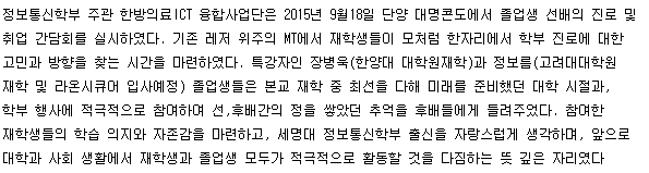 본문 시작 홈으로 SMIT 소식 SMIT 소개 SMIT 교육 SMIT 취업 SMIT 소식 SMIT 입학 홈페이지가이드 갤러리 공지사항 갤러리 경진대회 동아리 갤러리 페이스북 트위터 프린트 정보통신학부, "글로벌 정통 MT" 개최 관리자 5854 2015-09-30 정보통신학부, "글로벌 정통 MT" 개최 목록 이전한방-의료ICT 융합사업단, 졸업생 진로 및 취업간담회 실시 다음 한방-의료ICT 융합사업단, 캡스톤 디자인 경진대회 실시 담당부서 : 스마트IT학부 담당자 : - 연락처 : 043-649-1275 최종수정일 : 2024-10-26 만족도조사 만족도 조사 이 페이지에서 제공하는 정보에 대하여 만족하시나요? 매우만족 만족 보통 불만족 매우불만족