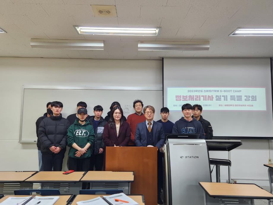 본문 시작 홈으로 SMIT 소식 SMIT 소개 SMIT 교육 SMIT 취업 SMIT 소식 SMIT 입학 홈페이지가이드 갤러리 공지사항 갤러리 경진대회 동아리 갤러리 페이스북 트위터 프린트 S-Boot Camp 정보처리기사 실기 특강 스마트IT학부 2331 2023-11-29 스마트IT학부는 4학년 재학생들을 대상으로 첨단정보학관 402호에서 2023.11.01(수), 08(수), 15(수), 22(수) 총 4주 동안 S-Boot Camp 정보처리기사 실기 특강을 시행했습니다. S-Boot Camp 정보처리기 실기 특강으로 학생들의 직무 역량을 강화할 수 있는 유익한 시간이었습니다. 목록 이전📌 잊지 말고! 수시 최초합격자 등록하자!! 다음 📌 2024학년도 세명대 정시 모집요강 안내 📌 담당부서 : 스마트IT학부 담당자 : - 연락처 : 043-649-1275 최종수정일 : 2024-10-26 만족도조사 만족도 조사 이 페이지에서 제공하는 정보에 대하여 만족하시나요? 매우만족 만족 보통 불만족 매우불만족