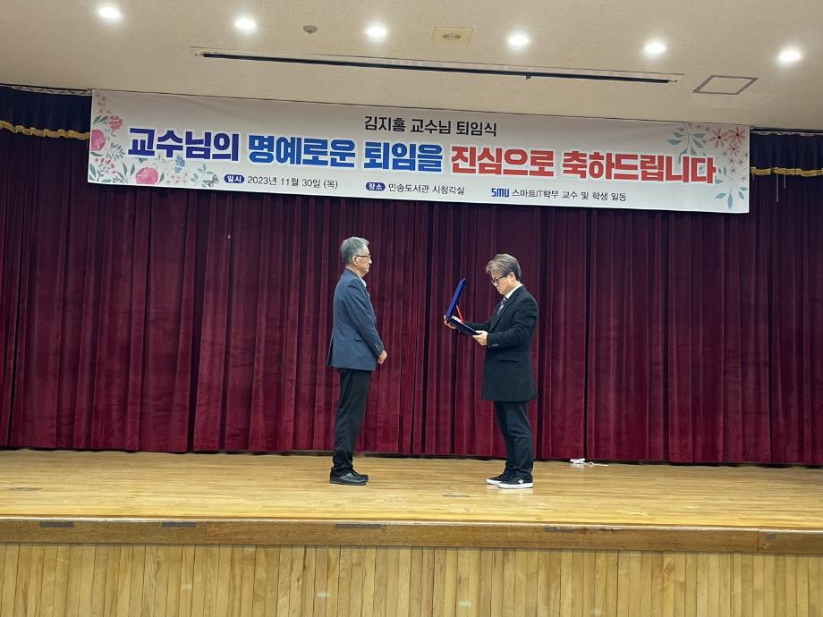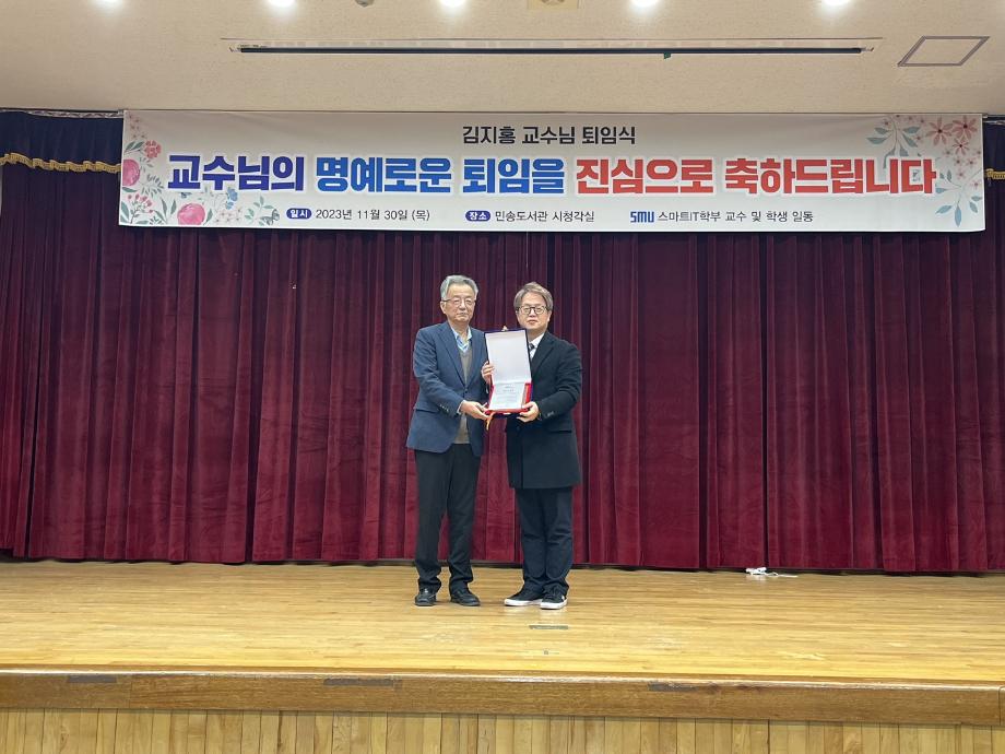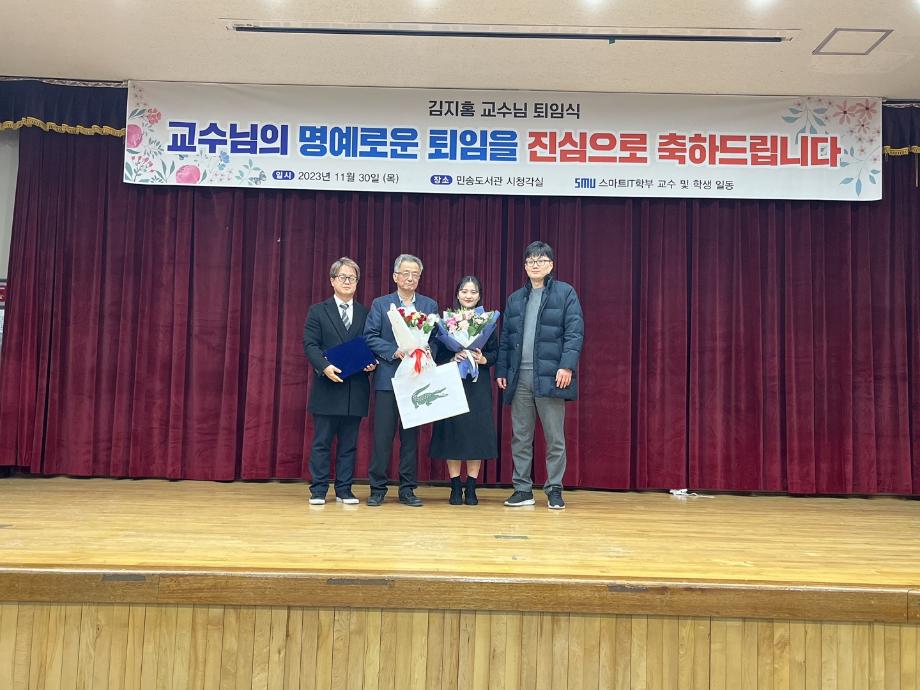 본문 시작 홈으로 SMIT 소식 SMIT 소개 SMIT 교육 SMIT 취업 SMIT 소식 SMIT 입학 홈페이지가이드 갤러리 공지사항 갤러리 경진대회 동아리 갤러리 페이스북 트위터 프린트 김지홍 교수님 퇴임식 진행 스마트IT학부 2608 2023-12-04 2023.11.30(목)에 스마트IT학부 김지홍 교수님의 명예로운 퇴임식이 시행 되었다. 본 행사는 <캡스톤 디자인 중간 발표회> 행사가 끝난 후 진행 되었다. 학생들의 영상편지와 재직 기념패 증정 및 꽃다발 증정으로 이루어졌다. 김지홍 교수님의 퇴임사와 권혁민 교수님의 축하 인사말이 있었다. 스마트IT학부 재학생들과 교수님들은 진심으로 김지홍 교수님의 명예로운 퇴임을 축하 하였다. 목록 이전스마트IT학부 캡스톤디자인 중간발표회 시행 다음 2023학년도 총장표창 수상 ! 담당부서 : 스마트IT학부 담당자 : - 연락처 : 043-649-1275 최종수정일 : 2024-10-26 만족도조사 만족도 조사 이 페이지에서 제공하는 정보에 대하여 만족하시나요? 매우만족 만족 보통 불만족 매우불만족