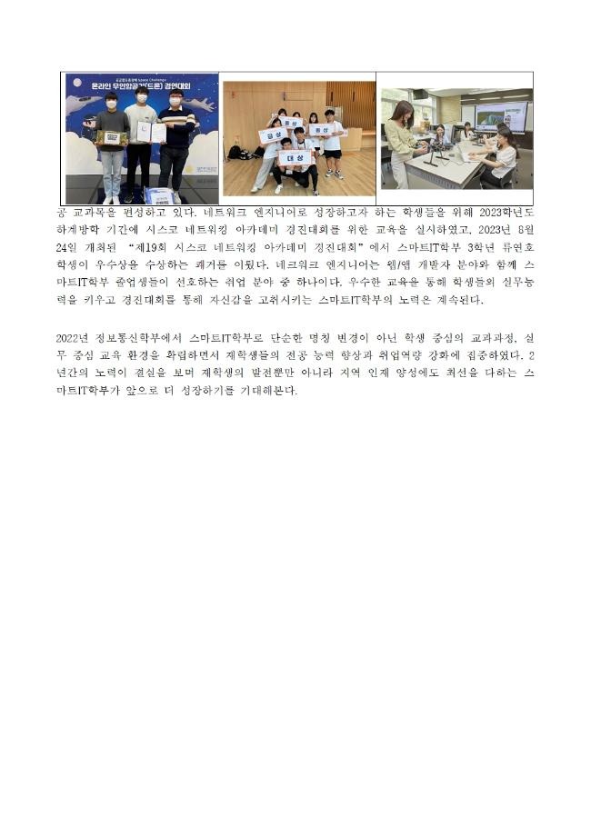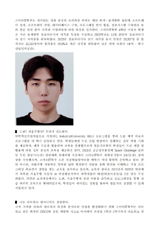 본문 시작 홈으로 SMIT 소식 SMIT 소개 SMIT 교육 SMIT 취업 SMIT 소식 SMIT 입학 홈페이지가이드 갤러리 공지사항 갤러리 경진대회 동아리 갤러리 페이스북 트위터 프린트 실무경험 ? 자격증? 취업 All in 세명대학교 스마트IT학부 스마트IT학부 2065 2024-01-04 안녕하세요. 세명대학교 스마트IT학부입니다. 스마트IT학부 보도자료 내용입니다. 실무경험? 자격증? 취업? All in 세명대학교 스마트IT학부! -실무능력을 중심으로 교과과정 개편 -자격증? 어려워도 우리는 자신있다 ! -드론? 자율주행차? 우리가 선도한다 -나는 네트워크 엔지니어로 성장한다. 목록 이전세명대학교 스마트IT학부는 이런 활동을 한다 ❗ 다음 동계방학 특별활동 “정보처리기사 자격증 특강” 실시!📚 담당부서 : 스마트IT학부 담당자 : - 연락처 : 043-649-1275 최종수정일 : 2024-10-26 만족도조사 만족도 조사 이 페이지에서 제공하는 정보에 대하여 만족하시나요? 매우만족 만족 보통 불만족 매우불만족