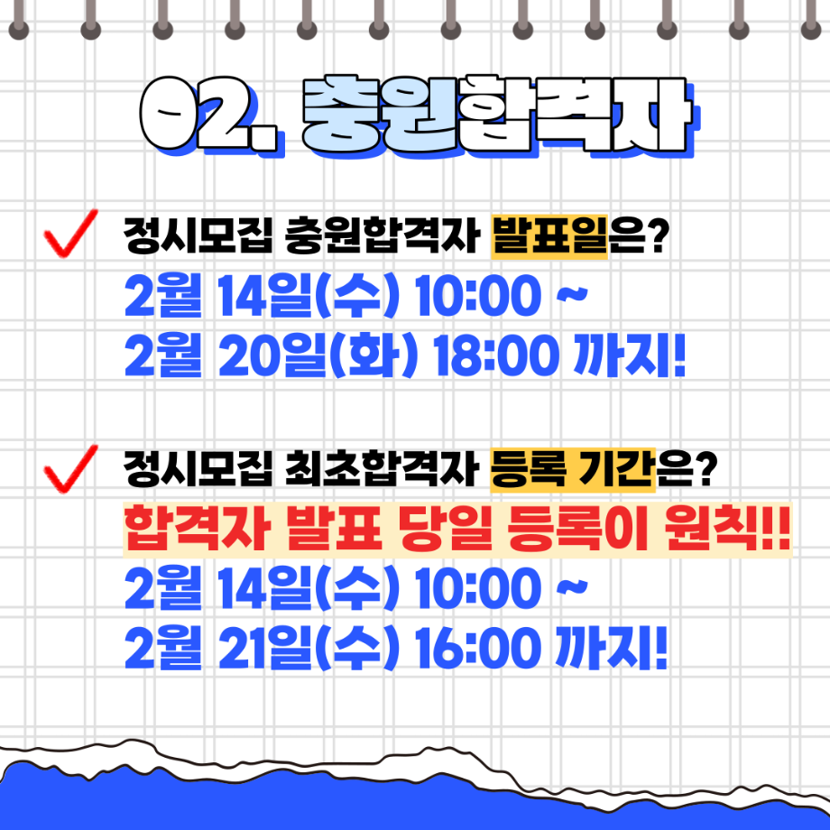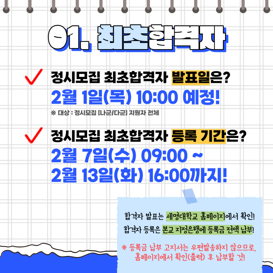 본문 시작 홈으로 SMIT 소식 SMIT 소개 SMIT 교육 SMIT 취업 SMIT 소식 SMIT 입학 홈페이지가이드 갤러리 공지사항 갤러리 경진대회 동아리 갤러리 페이스북 트위터 프린트 세명대학교 2024학년도 정시 합격자 발표 및 등록 일정 총정리💡 스마트IT학부 1922 2024-01-25 세명대학교 2024학년도 정시 합격자 발표 및 등록 일정 총정리💡 안녕하세요. 세명대학교 스마트IT학부입니다. 2024학년도 정시 합격자 발표 및 등록 일정 총정리입니다 😍 정시 발표 및 등록 일정 꼭 확인 하셔서 차질 없으시길 바랍니다. 😊 3월에 세명대학교 스마트IT학부에서 꼭 만나요🥰 목록 이전동계방학 특별활동 “정보처리기사 자격증 특강” 실시!📚 다음 2024학년도 꿈설계학기 라인업 ✨ 담당부서 : 스마트IT학부 담당자 : - 연락처 : 043-649-1275 최종수정일 : 2024-10-26 만족도조사 만족도 조사 이 페이지에서 제공하는 정보에 대하여 만족하시나요? 매우만족 만족 보통 불만족 매우불만족