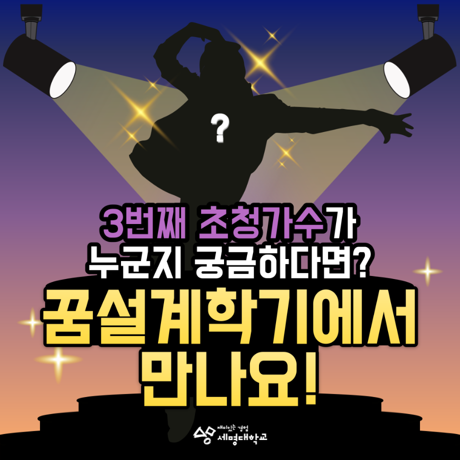 본문 시작 홈으로 SMIT 소식 SMIT 소개 SMIT 교육 SMIT 취업 SMIT 소식 SMIT 입학 홈페이지가이드 갤러리 공지사항 갤러리 경진대회 동아리 갤러리 페이스북 트위터 프린트 2024학년도 꿈설계학기 라인업 ✨ 스마트IT학부 2047 2024-02-01 세명대 2024 신입생 꿈설계학기(OT) 초청가수 라인업이 유출됐다?! 세명대학교의 2월에 절대 빠질 수 없는 행사, ✨꿈설계학기!✨ 2024 꿈설계학기 초청가수 라인업이 유출되었다는데...?!😮 🎵 첫번째 가수 힌트! 나에게만~ 준비된 OO같아~ 🎵 두번째 가수 힌트! 쇼미더머니 출신 여성 래퍼! 🎵 그리고 세번째 가수는 과연 누구일까요?🤔 세 번째 가수가 궁금하다면? 2월 19일! 꿈설계학기에서 만나요😎 목록 이전세명대학교 2024학년도 정시 합격자 발표 및 등록 일정 총정리💡 다음 스마트IT학부 전기 학위수여식 진행 ! 담당부서 : 스마트IT학부 담당자 : - 연락처 : 043-649-1275 최종수정일 : 2024-10-26 만족도조사 만족도 조사 이 페이지에서 제공하는 정보에 대하여 만족하시나요? 매우만족 만족 보통 불만족 매우불만족