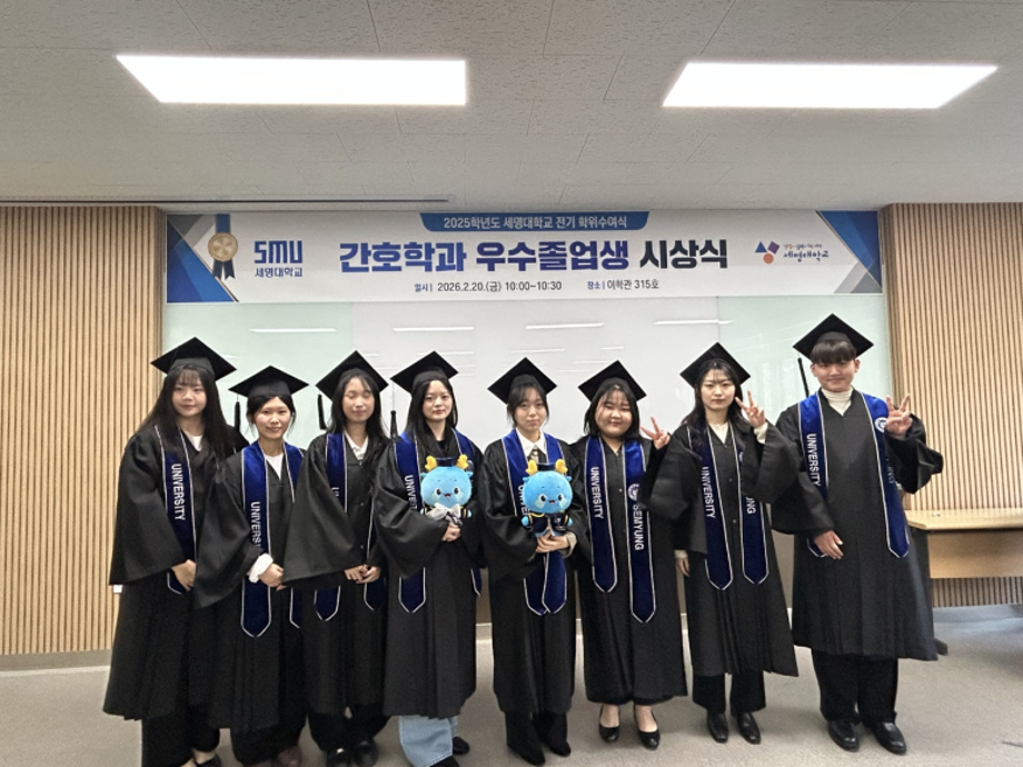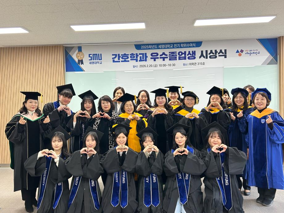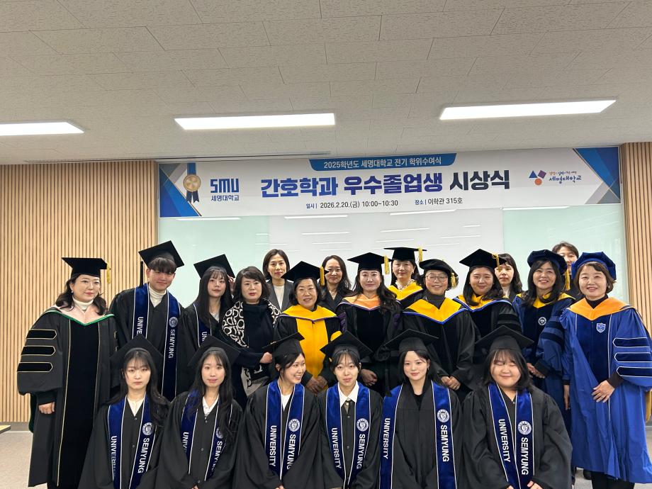 본문 시작 홈으로 커뮤니티 학과소개 교수소개 교육과정 학과소식 학과특성화 사업 커뮤니티 홈페이지가이드 포토갤러리 학사일정 포토갤러리 학생회 학과동아리 학과 취업정보 동창회 학과운영개선의견 발전기금 포토갤러리 페이스북 트위터 프린트 2025학년도 세명대학교 간호학과 학위수여식🎓 간호학과 736 2026-02-23 세명대학교 간호학과 졸업생들은 2025학년도 학위수여식을 통해 4년간의 배움과 성장을 마무리하고 새로운 출발선에 섰습니다. 빛나는 졸업의 순간이 담긴 현장이 궁금하시다면, 아래 링크를 클릭해 주세요. 👉 [학위수여식 현장 보러가기] https://blog.naver.com/nursing_smu_official/224192111491 목록 이전세명대학교 간호학과 제66회 간호사 국가시험 임장지도 실시 다음 2026학년도 꿈설계학기 담당부서 : 간호학과 담당자 : - 연락처 : 043-649-1357 최종수정일 : 2024-10-26 만족도조사 만족도 조사 이 페이지에서 제공하는 정보에 대하여 만족하시나요? 매우만족 만족 보통 불만족 매우불만족