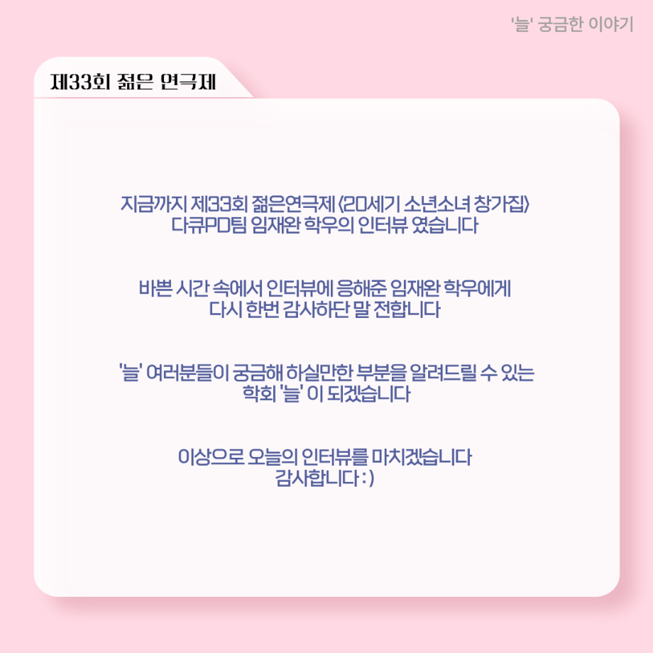 본문 시작 홈으로 커뮤니티 학과소개 입학정보 교수소개 학과과정 커뮤니티 공연예매 안내 홈페이지가이드 포토갤러리 공지사항 포토갤러리 작품DB 동아리 학사일정 학생회 포토갤러리 페이스북 트위터 프린트 ‘늘‘ 궁금한 이야기 - 젊은연극제 ‘20세기 소년소녀 창가집’ 다큐pd 役 < 임재완 > 연기예술학과 675 2025-09-12 . 목록 이전‘늘‘ 궁금한 이야기 - 젊은연극제 ‘20세기 소년소녀 창가집’ 종이연극 아저씨 役 < 윤준호 > 다음 ‘늘‘ 궁금한 이야기 - 현장실습 < 이종서 > 담당부서 : 연기예술학과 담당자 : - 연락처 : 043-649-1733 최종수정일 : 2024-10-26 만족도조사 만족도 조사 이 페이지에서 제공하는 정보에 대하여 만족하시나요? 매우만족 만족 보통 불만족 매우불만족