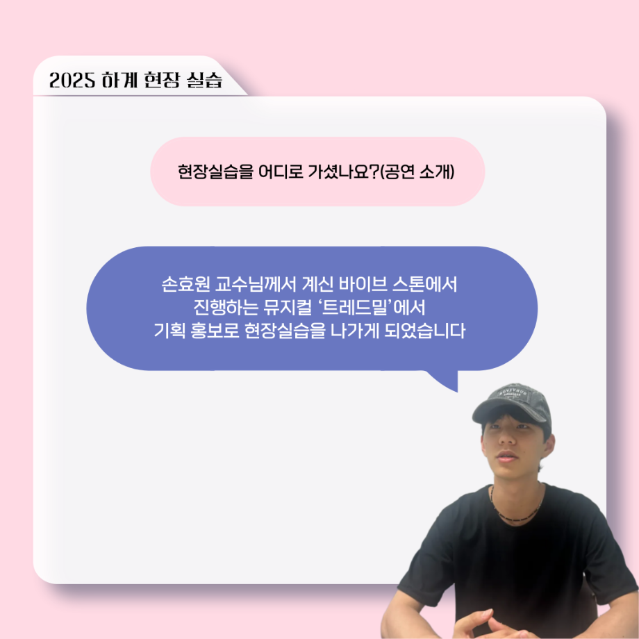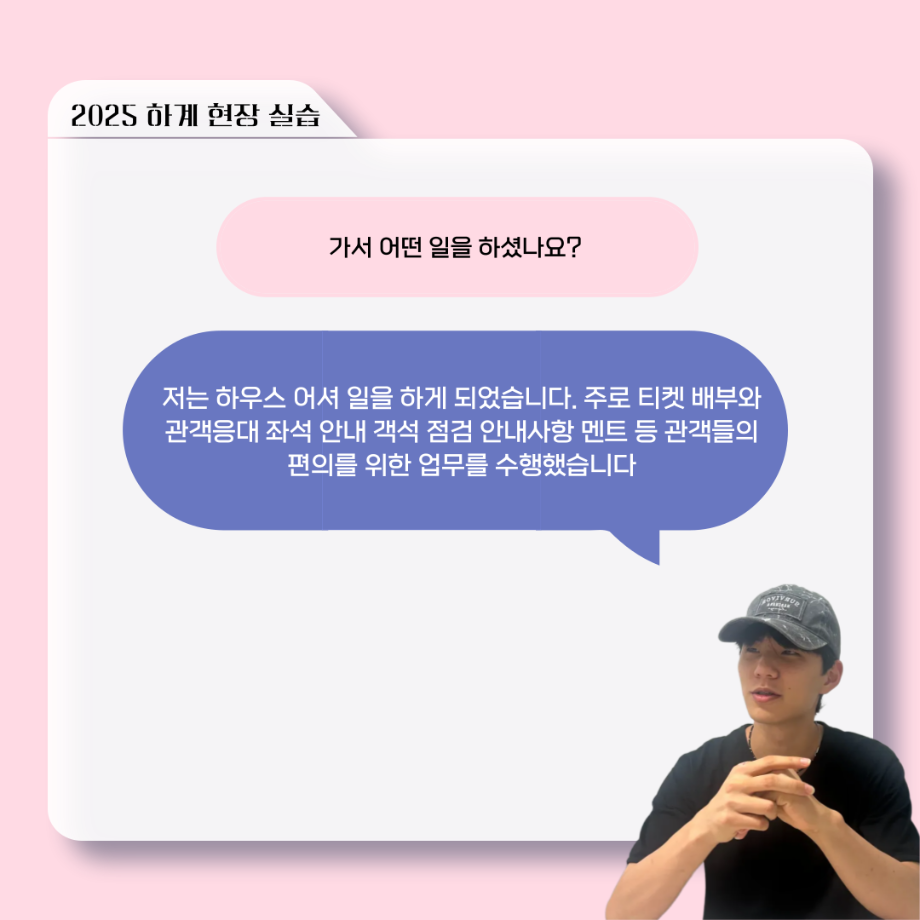 본문 시작 홈으로 커뮤니티 학과소개 입학정보 교수소개 학과과정 커뮤니티 공연예매 안내 홈페이지가이드 포토갤러리 공지사항 포토갤러리 작품DB 동아리 학사일정 학생회 포토갤러리 페이스북 트위터 프린트 ‘늘‘ 궁금한 이야기 - 현장실습 < 이종서 > 연기예술학과 942 2025-09-17 . 목록 이전‘늘‘ 궁금한 이야기 - 젊은연극제 ‘20세기 소년소녀 창가집’ 다큐pd 役 < 임재완 > 이전117회 세명대학교 연기예술학과 하계프로젝트 사랑의온도 작품소개 담당부서 : 연기예술학과 담당자 : - 연락처 : 043-649-1733 최종수정일 : 2024-10-26 만족도조사 만족도 조사 이 페이지에서 제공하는 정보에 대하여 만족하시나요? 매우만족 만족 보통 불만족 매우불만족