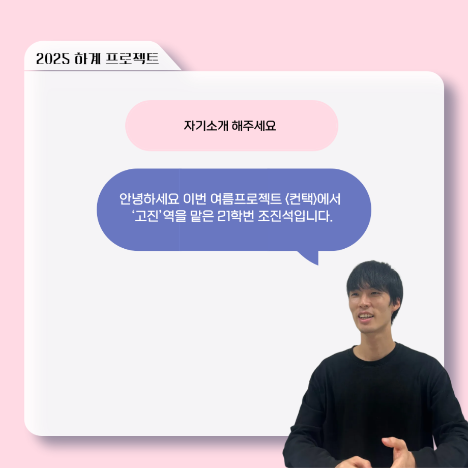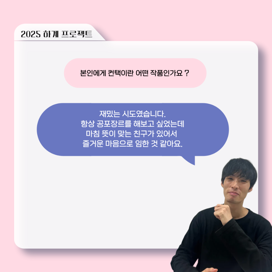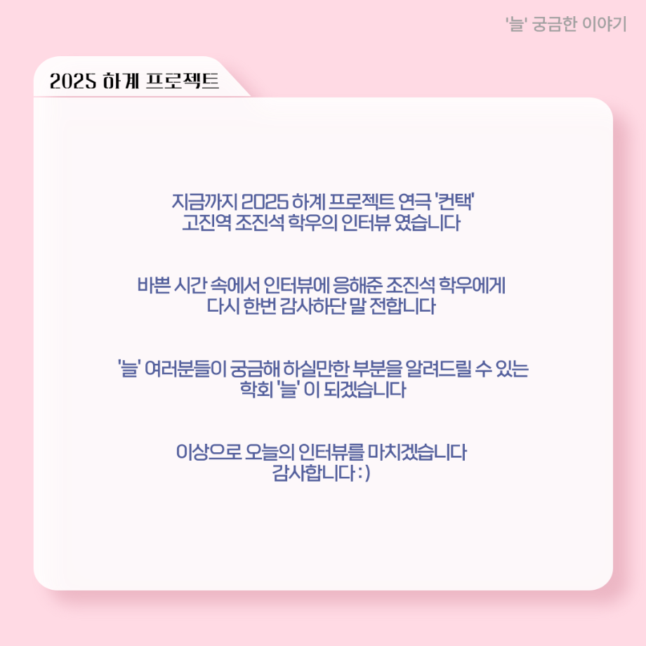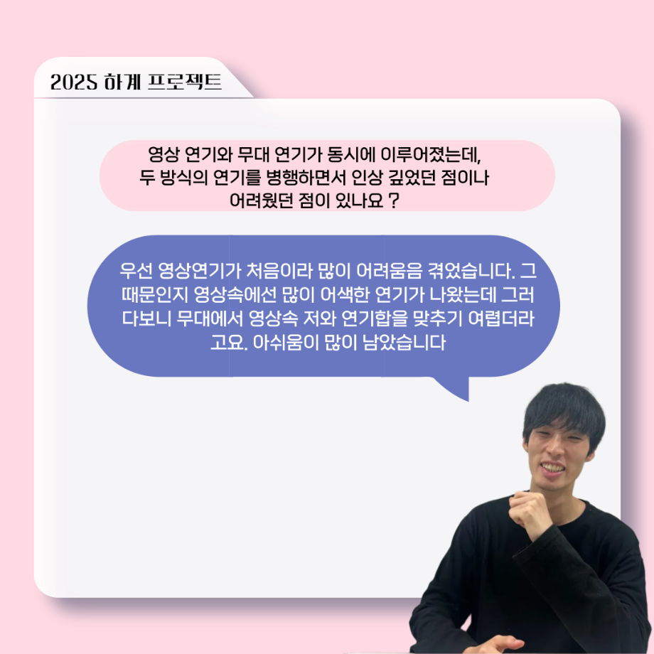 본문 시작 홈으로 커뮤니티 학과소개 입학정보 교수소개 학과과정 커뮤니티 공연예매 안내 홈페이지가이드 포토갤러리 공지사항 포토갤러리 작품DB 동아리 학사일정 학생회 포토갤러리 페이스북 트위터 프린트 ‘늘‘ 궁금한 이야기 - 하계 프로젝트 ‘컨택’팀 고진役 < 조진석 > 연기예술학과 1333 2025-10-31 . 목록 이전‘늘‘ 궁금한 이야기 - 현장실습 < 신하연 > 다음 세명대학교 연기예술학과 과체전 담당부서 : 연기예술학과 담당자 : - 연락처 : 043-649-1733 최종수정일 : 2024-10-26 만족도조사 만족도 조사 이 페이지에서 제공하는 정보에 대하여 만족하시나요? 매우만족 만족 보통 불만족 매우불만족