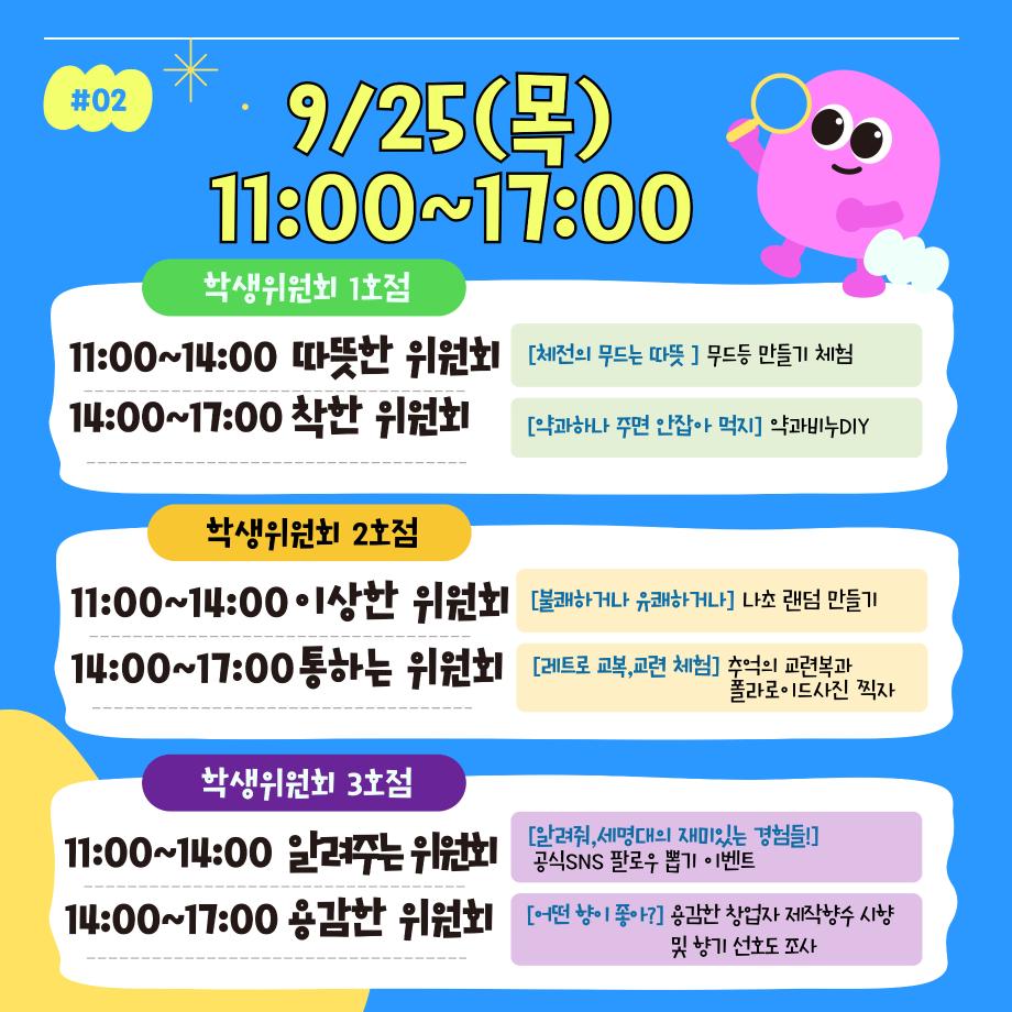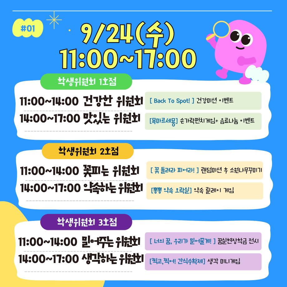 본문 시작 홈으로 공지사항 학생위원회 개요 학생위원회 소개 공지사항 활동결과 홈페이지가이드 프로그램 계획 프로그램 계획 세명대학교 공지사항 프로그램 계획 페이스북 트위터 프린트 [학생위원회] 청룡체전기간 학생위원회 전체활동안내 학생처 168 2025-09-24 청룡체전기간 학생위원회 활동을 아래와 같이 안내드리니 많은 참여 부탁드립니다. 목록 이전[약속하는 위원회]뿅뿅! 약속 오락실! 다음 [꽃피는 위원회] 꽃 돌려라 피어라! 담당부서 : 장학복지팀 담당자 : - 연락처 : 043-649-1142 최종수정일 : 2024-10-26 만족도조사 만족도 조사 이 페이지에서 제공하는 정보에 대하여 만족하시나요? 매우만족 만족 보통 불만족 매우불만족