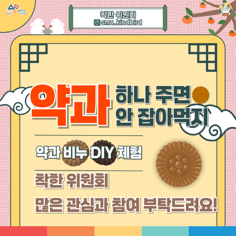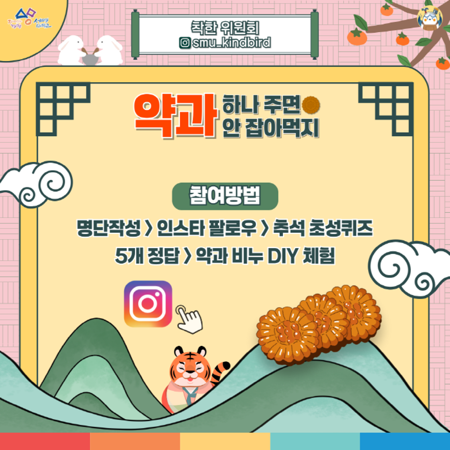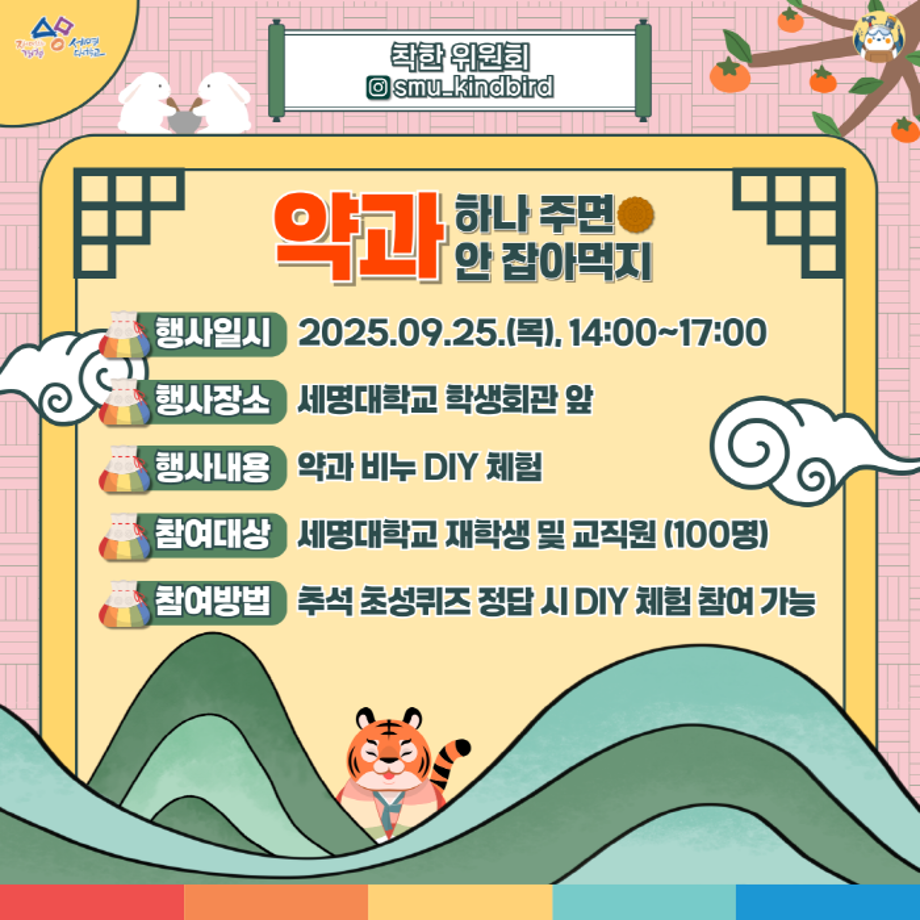 본문 시작 홈으로 공지사항 학생위원회 개요 학생위원회 소개 공지사항 활동결과 홈페이지가이드 프로그램 계획 프로그램 계획 세명대학교 공지사항 프로그램 계획 페이스북 트위터 프린트 [착한 위원회] 약과하나 주면 안잡아 먹지 학생처 162 2025-09-24 [착한 위원회] 약과 하나 주면 안 잡아먹지 1. 행사일시 ■ 2025년 9월 25일(목), 14시~17시 2. 행사장소 ■ 본교 학생회관 앞 3. 행사내용 ■ 추석 추성퀴즈 및 약과 비누 DIY 체험 4. 참여대상 ■ 본교 재학생 및 교직원 100명(선착순) 목록 이전[건강한 위원회] back tk spot 제자리로 다음 [꽃피는 위원회] 북!마크!해버렸지뭐야 담당부서 : 장학복지팀 담당자 : - 연락처 : 043-649-1142 최종수정일 : 2024-10-26 만족도조사 만족도 조사 이 페이지에서 제공하는 정보에 대하여 만족하시나요? 매우만족 만족 보통 불만족 매우불만족