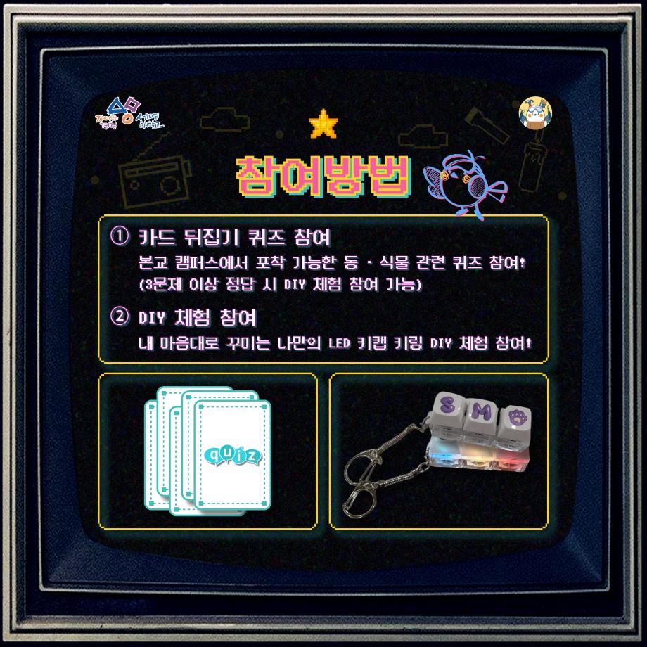 본문 시작 홈으로 공지사항 학생위원회 개요 학생위원회 소개 공지사항 활동결과 홈페이지가이드 프로그램 계획 프로그램 계획 세명대학교 공지사항 프로그램 계획 페이스북 트위터 프린트 [착한 위원회] 나만의 키 입력 중 학생처 195 2025-11-05 [착한 위원회] 나만의 키 입력 중 1. 행사일시 ■ 2025년 11월 05일(수), 12시~15시 2. 행사장소 ■ 본교 학생회관 앞 3. 행사내용 ■ 본교 캠퍼스에서 포착 가능한 동, 식물 관련 퀴즈 및 LED 키캡 키링 DIY 체험 4. 참여대상 ■ 본교 재학생 및 교직원 100명(선착순) 목록 이전[용감한 위원회] 창업? 다 이루어질지니~ 다음 [생각하는 위원회/ 약속하는 위원회] 세명파티시에 담당부서 : 장학복지팀 담당자 : - 연락처 : 043-649-1142 최종수정일 : 2024-10-26 만족도조사 만족도 조사 이 페이지에서 제공하는 정보에 대하여 만족하시나요? 매우만족 만족 보통 불만족 매우불만족