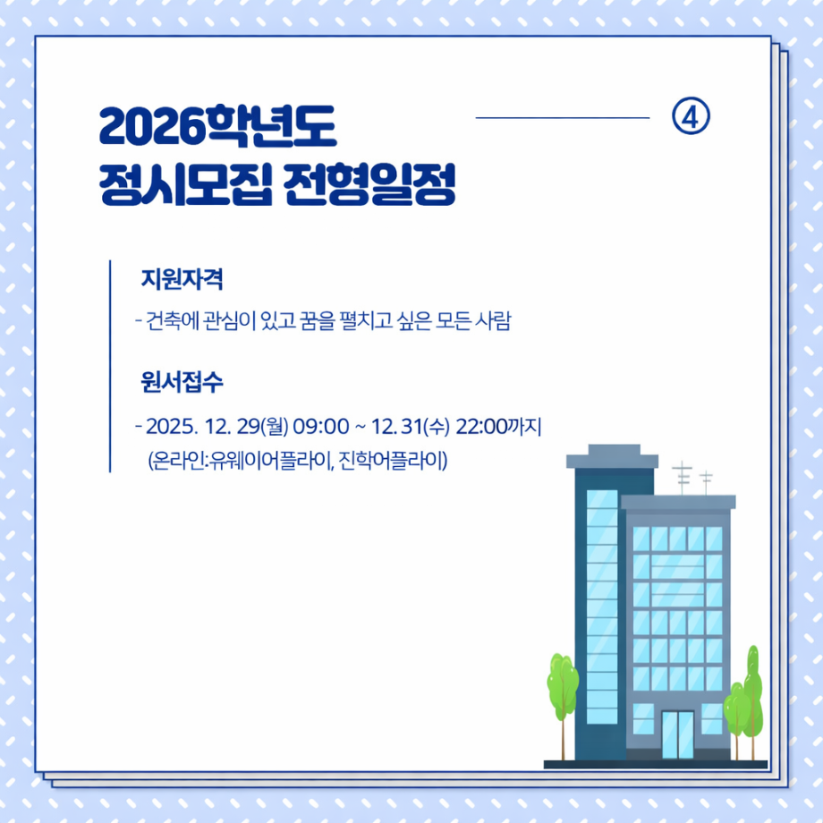 본문 시작 홈으로 커뮤니티 학과소개 교수소개 교육과정 학과 행사 및 활동 커뮤니티 홈페이지가이드 열린정보 학과일정 학과공지 채용정보 및 자료 열린정보 포토갤러리 먹거리, 즐길거리 포토갤러리 사진 사진 영상 사진 페이스북 트위터 프린트 사진 영상 [ 건축학과] 2026학년도 정시 원서접수(12.29~31) 건축학과 70 2025-12-30 목록 이전[2026 정시] 모집 안내 만족도조사 만족도 조사 이 페이지에서 제공하는 정보에 대하여 만족하시나요? 매우만족 만족 보통 불만족 매우불만족